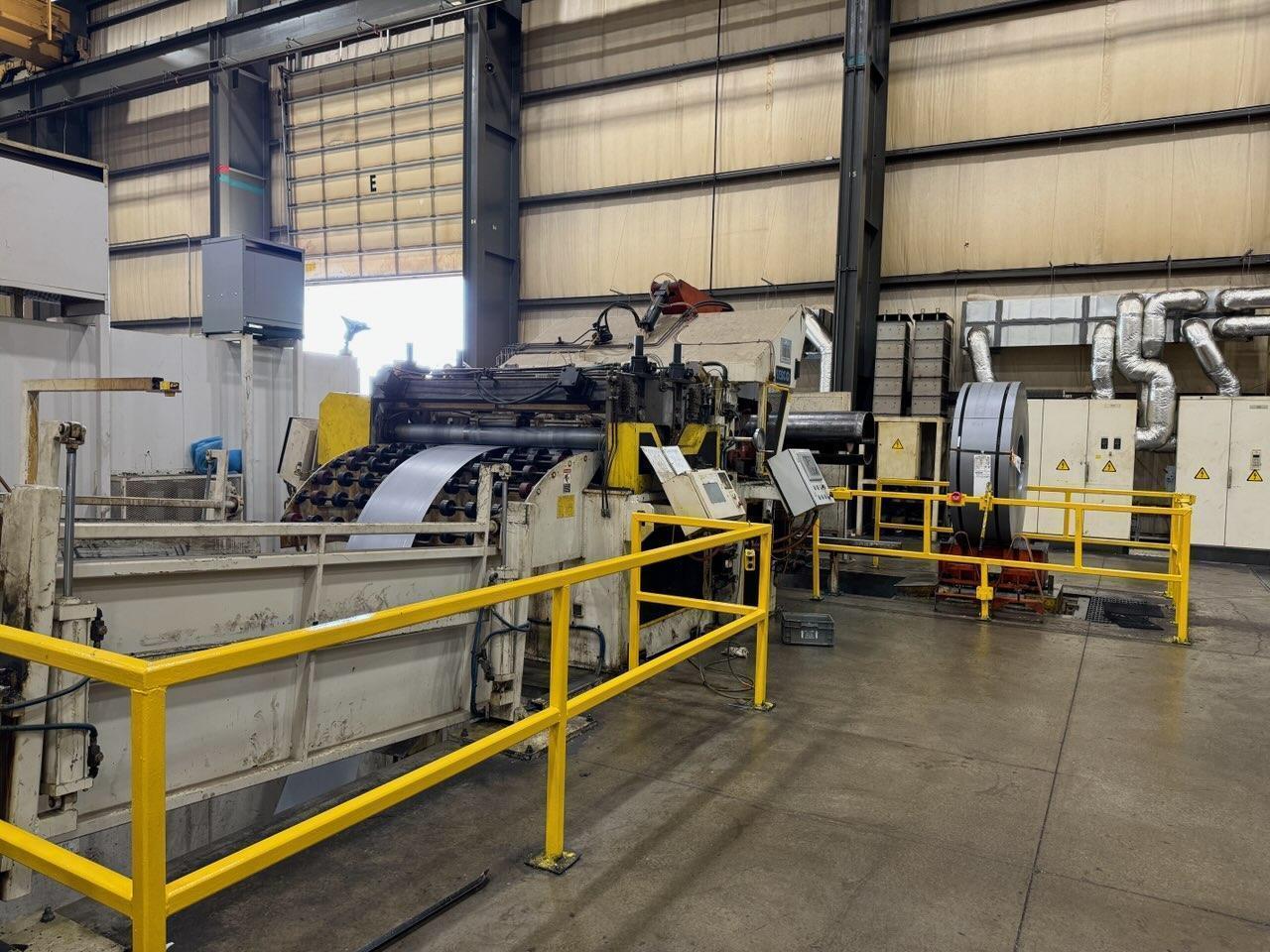 72" x 60,000 SESCO COIL FEED LINESESCO CONVENTIONAL COMPLETE COIL FEED LINE SPECIFICATIONS:COIL WEIGHT CAPACITY: 60,000 LBCOIL WIDTH CAPACITY: 72"STOCK THICKNESS CAPACITY: .125" X 72" WIDEEXPANSION RANGE: 22" - 26"COIL O.D. CAPACITY: 72"SESCO CONVENTIONAL COMPLETE COIL FEED LINE EQUIPMENT AND FEATURES:SESCO TRAVELING COIL REEL AND TRAVELING COIL LOAD CARTRAVERSING COIL REEL BASETHREE LEAF MANDREL WITH COIL KEEPER ARMSHYDRAULIC MANDREL EXPANSIONAIR BRAKE MOUNTED ON MAIN SPINDLEADJUSTABLE TENSIONINGTHREADING DRIVE FOR JOG FORWARD AND REVERSETRAVERSING COIL LOAD CARPOWER LIFT AND TRAVELNARROW COIL SUPPORTSCOIL STORAGE RACKSESCO PEELER, THREADER, HOLD DOWN ARM STATIONSTAND ALONE PTH STATIONHYDRAULIC HOLD DOWN ARM RAISE AND LOWERHYDRAULIC HOLD DOWN ARM MOTORIZED END WHEELHYDRAULIC PEELER TABLE RAISE AND LOWERHYDRAULIC PEELER TABLE SPADE EXTENSIONSESCO POWERED COIL STRAIGHTENERENTRY AND EXIT PINCH ROLL ASSEMBLIES X 6" DIAMETERAIR OPERATED UPPER PINCH ROLL ADJUSTMENTSEVEN POWERED STRAIGHTENER ROLLS X 3" DIAMETERBANK TYPE UPPER STRAIGHTENING ROLL ADJUSTMENTS VIA SCREW JACKSADJUSTABLE STOCK WIDTH EDGE GUIDESDUAL FLIGHTS OF UPPER AND LOWER STRAIGHTENER ROLL BACK UPSEXIT CASCADE LOOP SUPPORT ROLLERSVARIABLE SPEED DRIVEOPERATOR'S CONTROL STATIONAUTO / RUN CYCLESESCO DUAL EXIT THREADING TABLEBOMB BAY DOOR DESIGNSESCO SERVO ROLL FEEDAIR OPERATED UPPER SERVO FEED ROLL ADJUSTMENT / PILOTENTRY SIDE CASCADE MATERIAL SUPPORT SECTIONSELF CENTERING DUAL ROLL STOCK WIDTH EDGE GUIDESSOLENOID CONTROLLED PILOT RELEASEAIR PRESSURE/REGULATORCABINET BASE MOUNTED W/ ADJUSTABLE PASS LINE HEIGHT